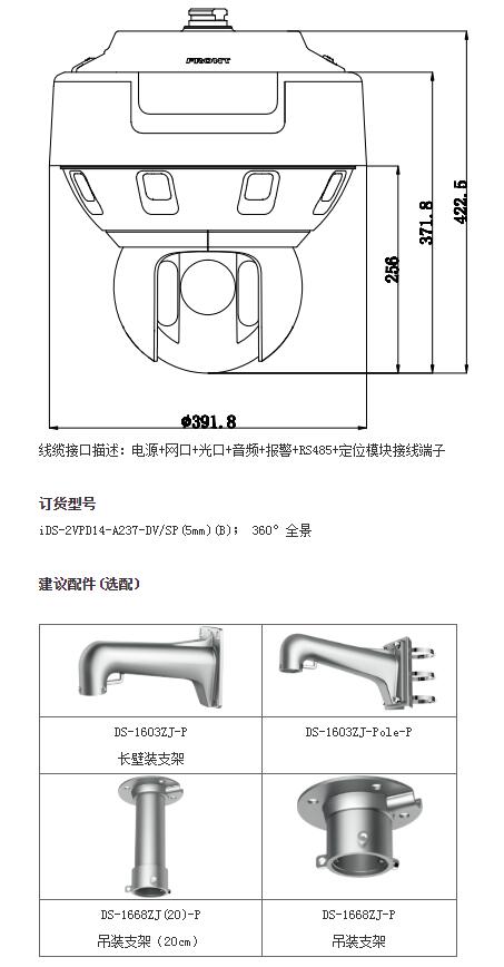 iDS-2VPD14-A237-DV/SP(5mm)(B)星光級(jí)全景網(wǎng)絡(luò)高清智能球機(jī),采用一體化設(shè)計(jì),單產(chǎn)品即可同時(shí)提供全景與特寫畫面,兼顧全景與細(xì)節(jié)。其中全景畫面由8個(gè)傳感器拼接而成,可實(shí)現(xiàn)360度的全景監(jiān)控;一體化機(jī)芯和高速云臺(tái)設(shè)計(jì),在全景監(jiān)控的同時(shí)為用戶提供快速細(xì)節(jié)定位功能。另外全景球機(jī)還集成了先進(jìn)的視頻分析算法和多目標(biāo)跟蹤算法程序,可實(shí)現(xiàn)自動(dòng)或手動(dòng)對(duì)全景區(qū)域內(nèi)的多個(gè)目標(biāo)進(jìn)行區(qū)域入侵、越界、進(jìn)入?yún)^(qū)域、離開區(qū)域行為的檢測,并可輸出報(bào)警信號(hào)和聯(lián)動(dòng)云臺(tái)跟蹤,從而滿足高等級(jí)要求的安保需求。